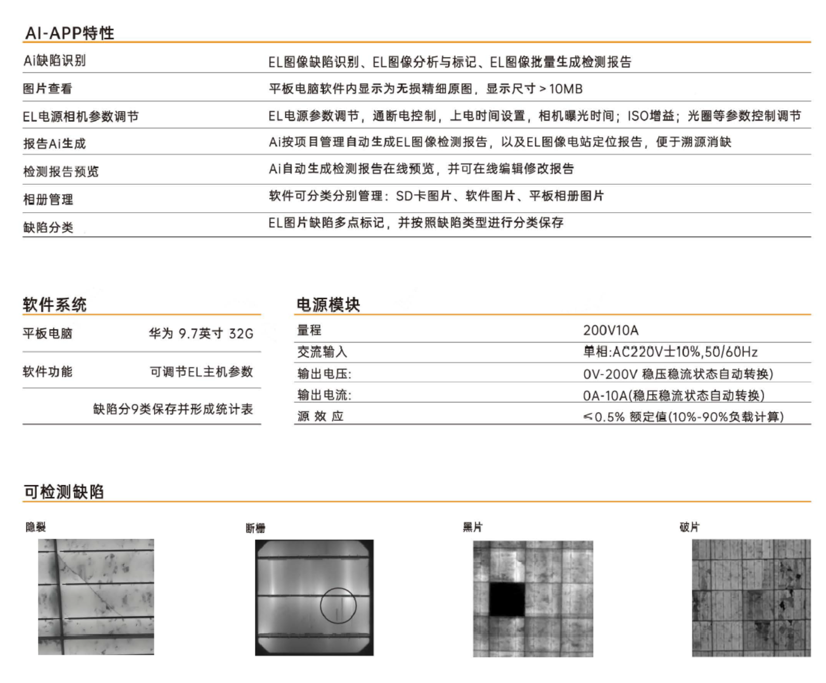 设备配备AI功能,可以对EL检测图进行内部缺陷的自动识别并标记,还可以远程控制EL相机内部所有参数调节,以及电源的通断点。