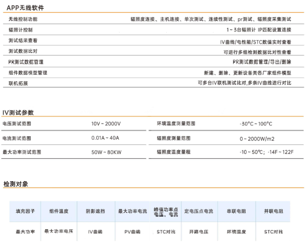 组件数据模型管理,新建、删除、更新设备类各厂家组件模型可进行多组检测数据比对性查看,IV主机数据导出平板或U盘无线控制功能,包括辐照度连接、主机连接、单次测试、连续性测试、pr测试等