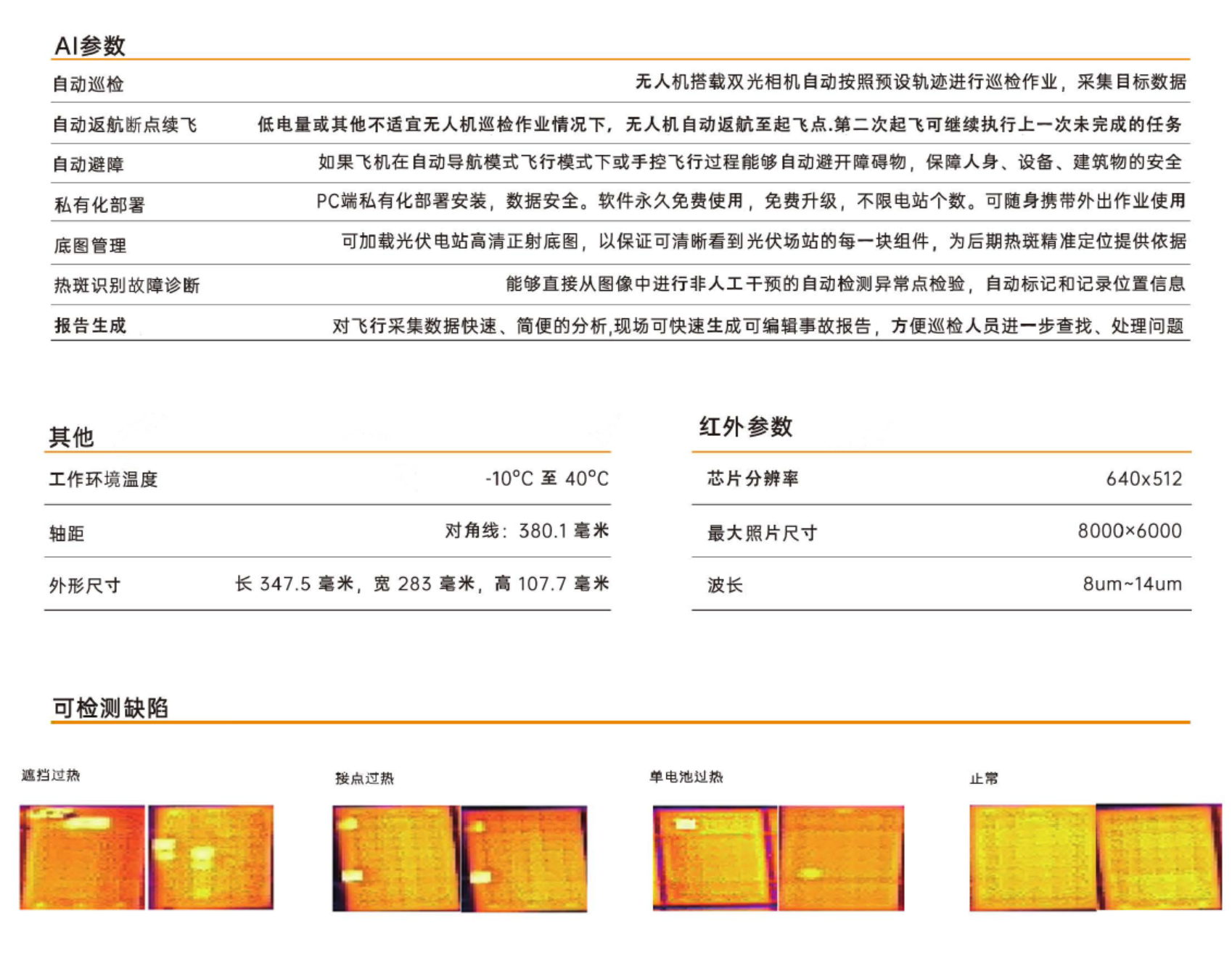 无人机热成像检测仪LP-FU100应用于光伏等电力系统的热点缺陷检测,可快速高效的完成电力系统的质量巡检可制定巡航轨迹自动进行运维,AI识别软件具备一键识别导出电站诊断检测报告。
